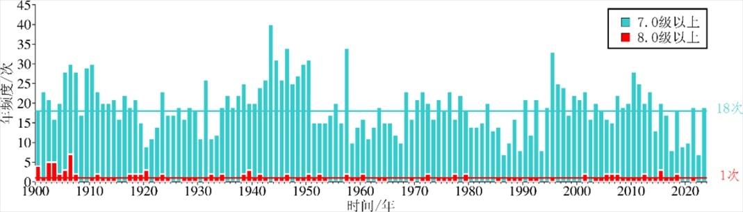 2023年全球未發(fā)生8級以上地震,最近一次為2021年7月29日美國阿拉斯加以南海域8.1級地震。2023年全球發(fā)生7級以上地震19次,與1900 年以來年均頻次(18 次)基本持平,顯著高于2022年7級以上地震的活動水平(7次)。