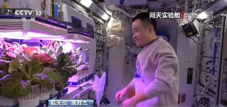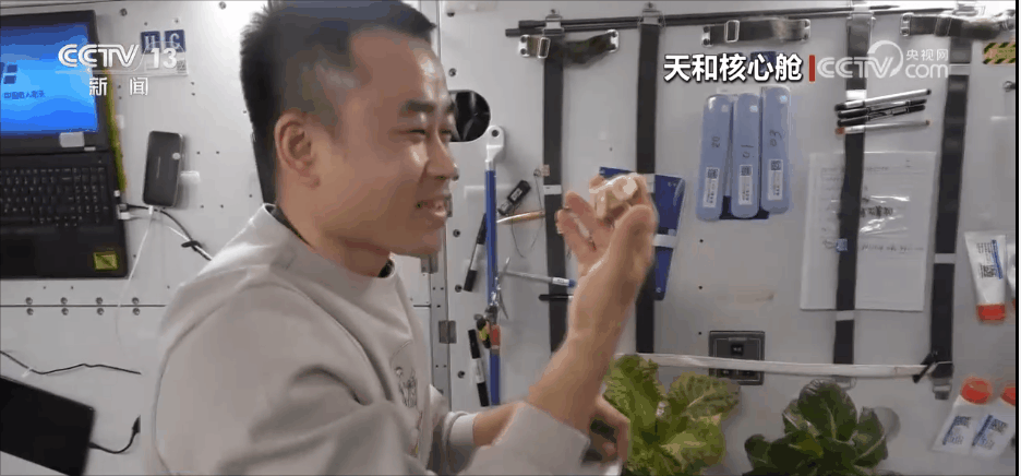 航天員 唐勝杰:你好,我正在對(duì)我們的櫻桃番茄進(jìn)行授粉。因?yàn)樘諞]有小蜜蜂,我就是那只小蜜蜂。大家看一看,這是我們的太空蔬菜,神十七乘組在“太空出差”期間,我們的太空菜園變得更大了,大家看看我們的蔬菜是不是長(zhǎng)勢(shì)喜人?今天是新年的第一天,江新林為我們準(zhǔn)備了營(yíng)養(yǎng)豐盛的太空午餐,但是我覺得今天應(yīng)該再增加一點(diǎn)綠色的、新鮮的蔬菜,午餐就會(huì)變得更豐盛了。大家可以看一看,看看我們的櫻桃番茄。誒,拿這兩杯,今天中午我們就吃這兩杯。
