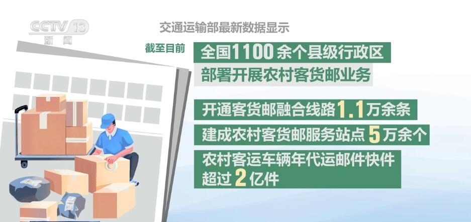 交通運(yùn)輸部發(fā)布數(shù)據(jù)顯示,全國1100余個(gè)縣級(jí)行政區(qū)部署開展了農(nóng)村客貨郵業(yè)務(wù),農(nóng)村客運(yùn)車輛年代運(yùn)郵件快件超過2億件。