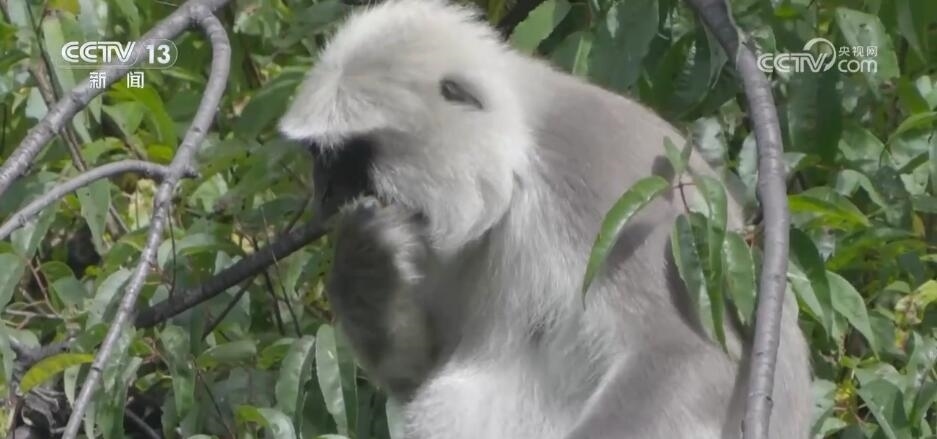 突然,林間騷動起來,幾只長尾葉猴從天而降來到塔爾羊中間,這是首次記錄到這兩個物種群體同框覓食的珍貴畫面。對它們而言,聚在一起可以加強警戒,更容易發(fā)現(xiàn)天敵。