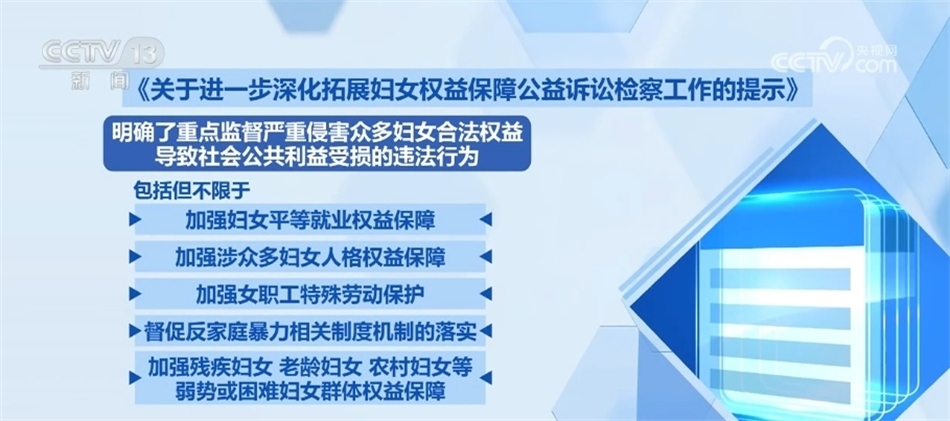 最高檢相關(guān)部門負(fù)責(zé)人介紹,2023年1月1日,修訂后的《中華人民共和國婦女權(quán)益保障法》正式施行,明確授權(quán)檢察機(jī)關(guān)開展婦女權(quán)益保障領(lǐng)域公益訴訟。實(shí)踐中,侵害婦女權(quán)益的違法情形往往存在一定的隱蔽性、復(fù)雜性?!豆ぷ魈崾尽芬?,要善于從刑事案件中發(fā)現(xiàn)普遍性、源頭性問題,強(qiáng)化訴源治理;要針對具體情況和具體問題,研判是否存在違法性和公益損害;要注意結(jié)合侵害婦女權(quán)益的不同違法情形,精準(zhǔn)確定監(jiān)督對象和監(jiān)督方式,充分實(shí)現(xiàn)公益保護(hù)目的。