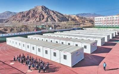 同樣是4日早晨,在民和縣官亭鎮(zhèn)中心學校,五星紅旗高高飄揚,一排排白色的活動板房里傳出瑯瑯讀書聲。教室里燈光明亮,嶄新的課桌上放著課本和作業(yè)本。從1月2日起,積石山6.2級地震青海震區(qū)的中小學線下復課復學。
