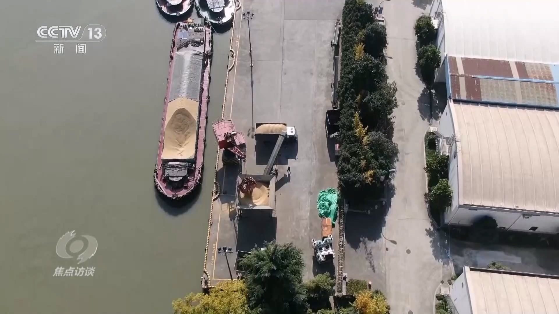 在京杭大運河浙江余杭段的這個碼頭上,貨船上的稻谷正在被轉(zhuǎn)送到貨車上。碼頭旁是浙江省糧食局直屬糧油儲備庫,稻谷將被儲存在這些倉庫里。