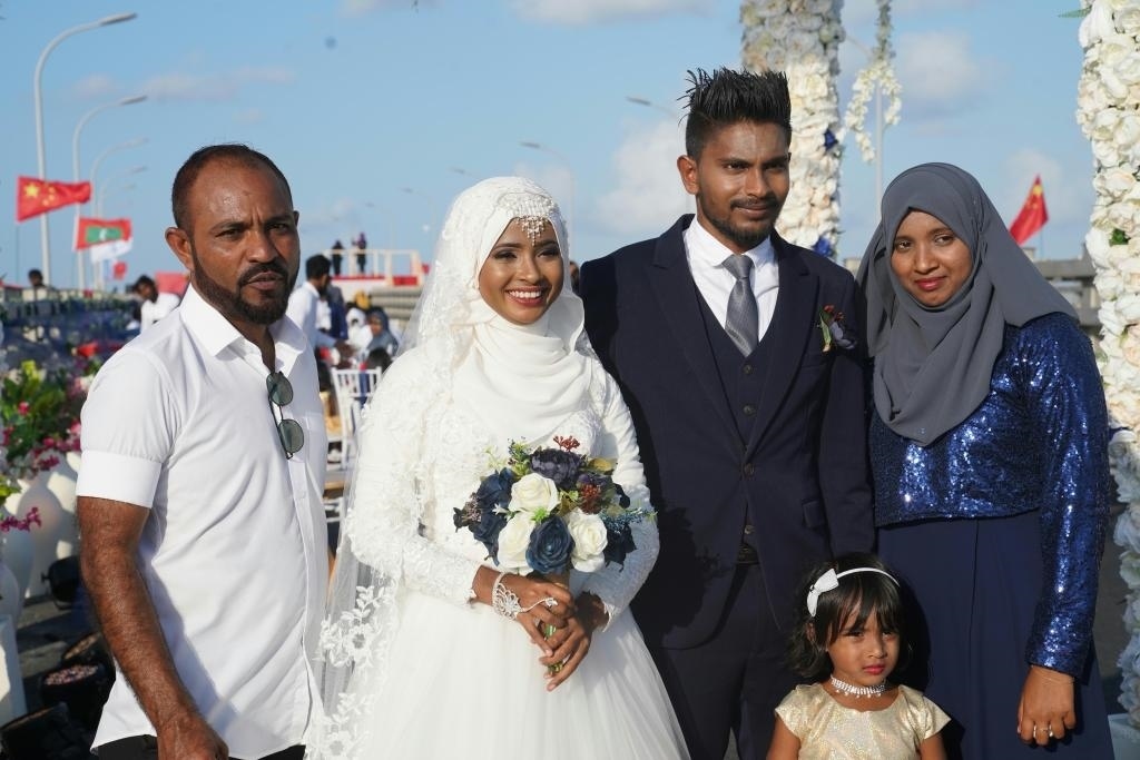 2018年8月31日,在剛剛正式通車的中馬友誼大橋上,一對(duì)馬爾代夫新婚夫婦與家人合影。