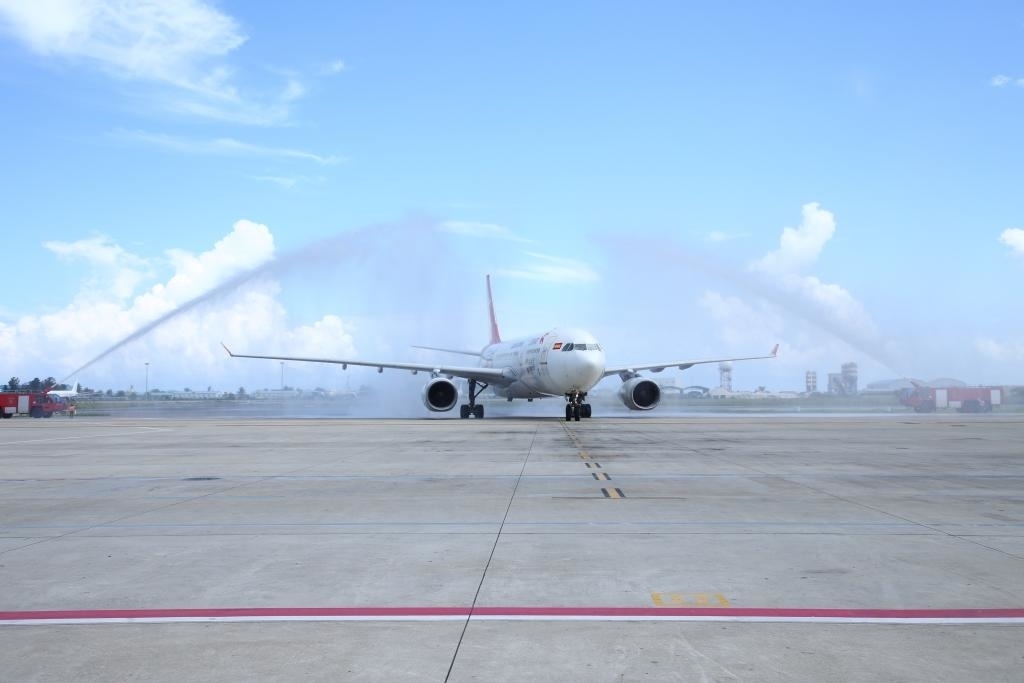 2023年1月18日,中國首都航空J(rèn)D455航班在馬爾代夫馬累維拉納國際機(jī)場接受水門禮。