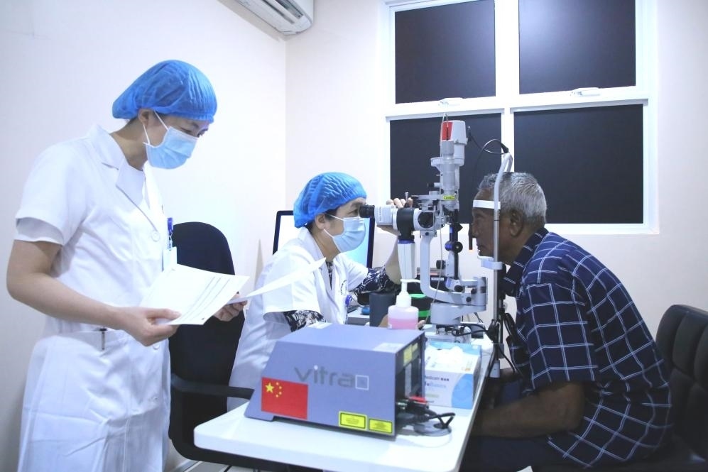 2023年2月4日,在馬爾代夫首都馬累附近的胡魯馬累醫(yī)院,中國-馬爾代夫眼科中心中方專家為當(dāng)?shù)鼗颊咦鲅劭茩z查。