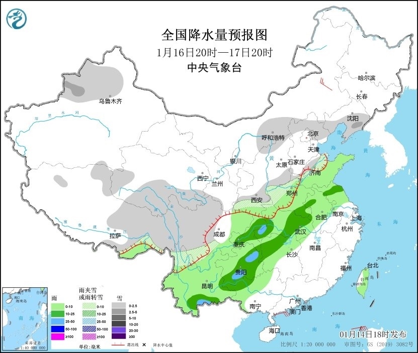 1月16日20時至17日20時,新疆西部、青海南部、西藏東部、內(nèi)蒙古中部、遼寧中南部、河北北部、川西高原、陜西南部、山西南部、河南西北部、山東西北部、云南西北部等地的部分地區(qū)有小到中雪或雨夾雪;黃淮大部、江淮大部、江漢、江南西部、四川東部、重慶、貴州、云南、廣西西部、臺灣島等地的部分地區(qū)有小到中雨,其中湖北西南部、貴州中部和東北部、云南南部等地的部分地區(qū)有大雨。內(nèi)蒙古東南部等地的部分地區(qū)有4~5級風(fēng)(見圖3)。