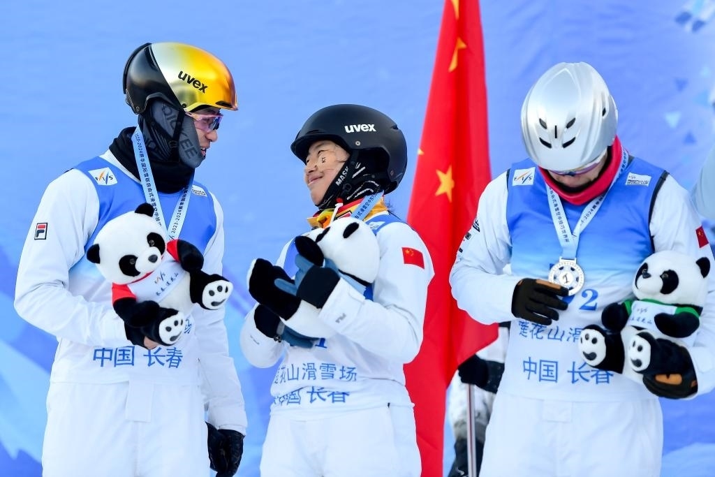12月17日,獲得亞軍的中國二隊選手陳梅婷(中)、王心迪(右)和李天馬在頒獎儀式上。當(dāng)日,2023-2024賽季國際雪聯(lián)自由式滑雪空中技巧世界杯(中國長春分站賽)男女混合團體決賽在吉林長春蓮花山滑雪場舉行。新華社記者 許暢 攝