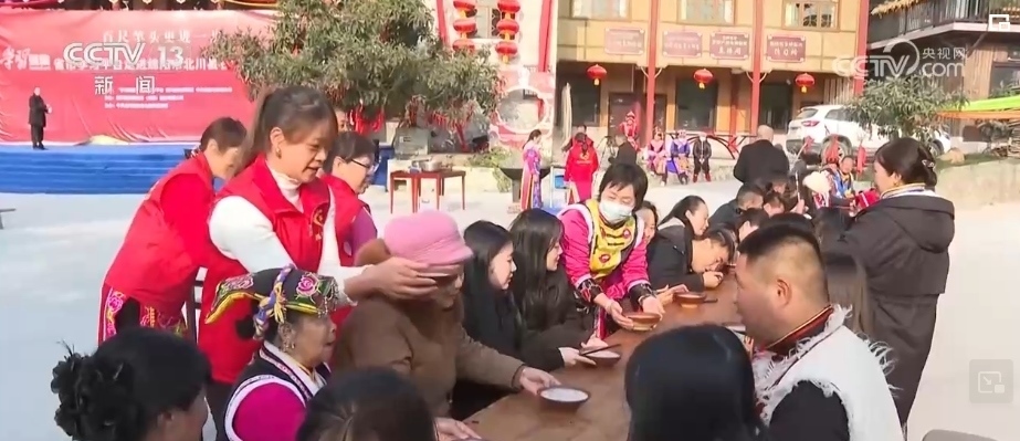 在四川綿陽市北川縣石椅村,一大早,村民和志愿者就忙著熬制臘八粥。石椅村熬制的臘八粥是咸味的,食材除了糯米、花生、白蘿卜、胡蘿卜,還有當(dāng)?shù)氐奶禺a(chǎn)臘肉和豆干。經(jīng)過一個(gè)多小時(shí)的熬制,別具風(fēng)味的臘八粥就起鍋了。村民們擺上長桌宴,把熱騰騰、香噴噴的臘八粥端到游客面前,一起感受年味兒。