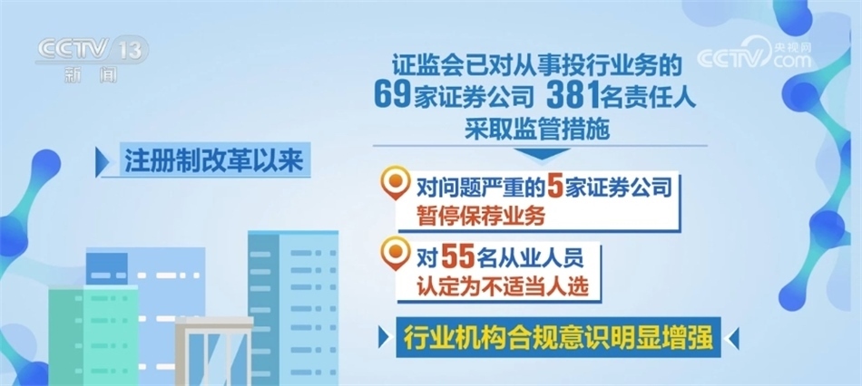 數(shù)據(jù)顯示,注冊制改革以來,證監(jiān)會已對從事投行業(yè)務的69家證券公司、381名責任人采取了監(jiān)管措施,特別是對問題嚴重的5家證券公司暫停保薦業(yè)務,對55名從業(yè)人員認定為不適當人選,行業(yè)機構(gòu)合規(guī)意識明顯增強。