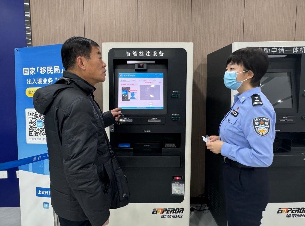 1月11日,在甘肅省蘭州市公安局出入境接待大廳,工作人員引導(dǎo)前來(lái)辦理出入境證件的市民使用智能簽注機(jī)。新華社記者 任延昕 攝