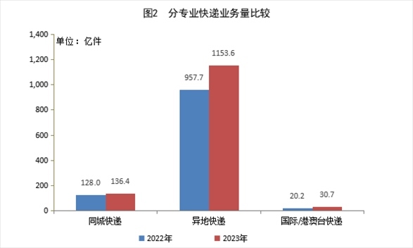2023年,同城快遞業(yè)務(wù)量累計(jì)完成136.4億件,同比增長6.6%;異地快遞業(yè)務(wù)量累計(jì)完成1153.6億件,同比增長20.5%;國際/港澳臺(tái)快遞業(yè)務(wù)量累計(jì)完成30.7億件,同比增長52.0%。