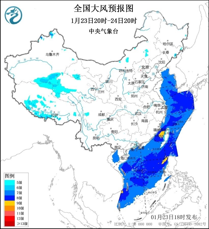 中央氣象臺1月23日18時繼續(xù)發(fā)布大風(fēng)藍(lán)色預(yù)警:預(yù)計,1月23日20時至24日20時,西藏南部、青海西部、福建沿海、廣東沿海等地的部分地區(qū)有5~6級、陣風(fēng)7~8級的大風(fēng);黃海大部海域、東海大部海域、臺灣海峽、臺灣以東洋面、巴士海峽、北部灣、南海大部海域?qū)⒂?~8級、陣風(fēng)9~10級的大風(fēng),其中臺灣海峽、巴士海峽、南海中東和西南部的部分海域風(fēng)力可達(dá)9級、陣風(fēng)10~11級。
