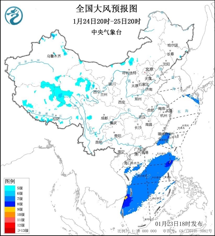 1月24日20時至25日20時,青海北部和西部、福建沿海等地部分地區(qū)有5~6級、陣風(fēng)7級的大風(fēng);臺灣海峽、巴士海峽、南海大部海域?qū)⒂?~8級、陣風(fēng)9~10級的大風(fēng),其中南海西南部的部分海域風(fēng)力可達(dá)9級、陣風(fēng)10級。