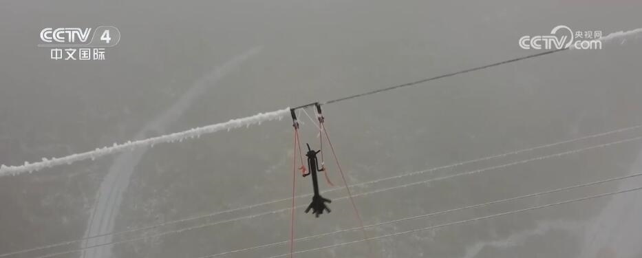 在海拔1400多米的貴州省黔東南苗族侗族自治州,部分地區(qū)最低溫度達(dá)到-6℃,供電線路覆冰厚度達(dá)11毫米。電力人員運(yùn)用機(jī)械震動(dòng)除冰裝置,對220千伏施柳線開展除冰。