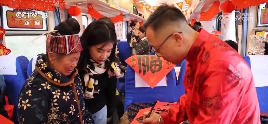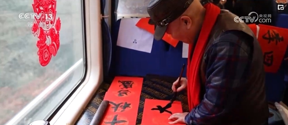 春節(jié)臨近,列車的車廂裝扮一新。鐵路部門還邀請了書法愛好者給旅客們寫春聯、送福字,為大家送出新春祝福。