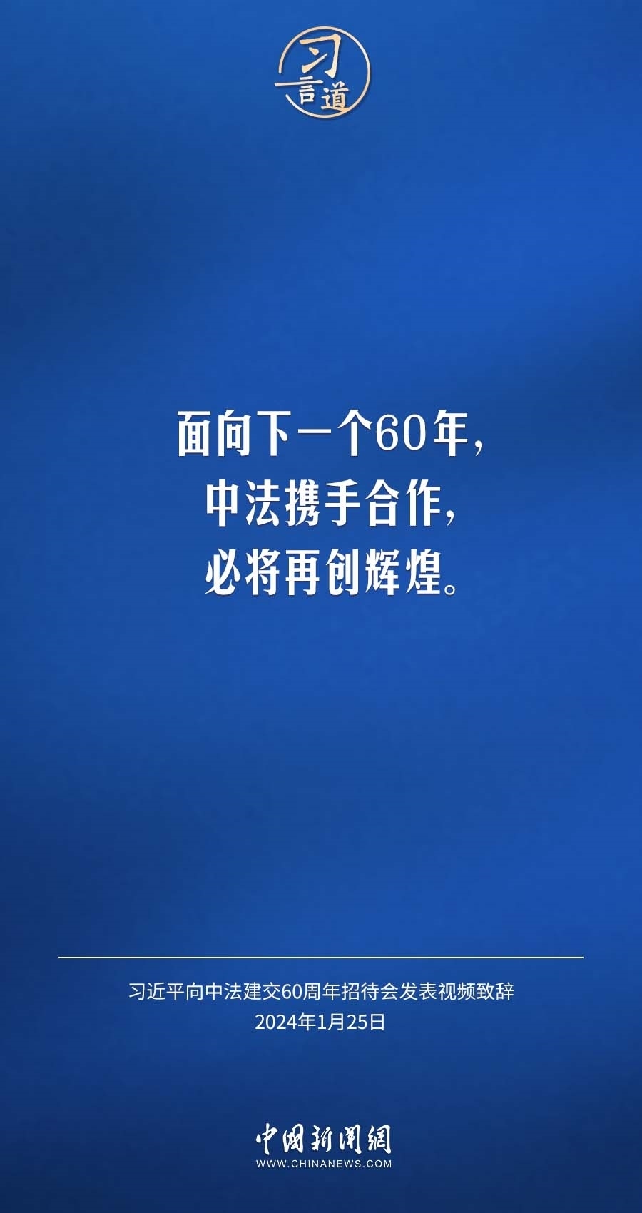 1月25日,中法建交60周年招待會(huì)在國家大劇院舉行,國家主席習(xí)近平發(fā)表視頻致辭。習(xí)近平指出——