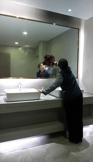 王柳云的保潔面積很大,整個(gè)寫字樓的十五層和十七層,地板、桌椅、窗戶、衛(wèi)生間,都是她的職責(zé)范圍。“很多人一開完會(huì),杯子、椅子、桌子要清理,還有窗子全部要擦干凈”,她形容自己的工作量“三四個(gè)人都干不完”,但她看中了這份工作留給她的一隅,隨便找個(gè)角落就可以寫字畫畫。