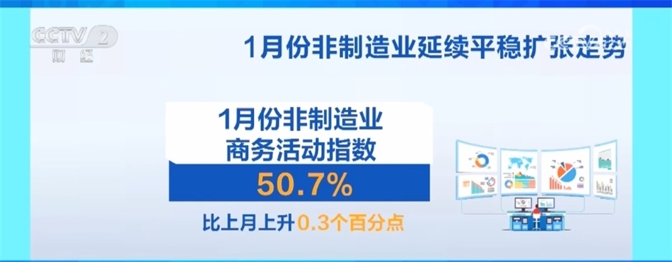此外,1月份非制造業(yè)商務(wù)活動指數(shù)為50.7%,比上月上升0.3個百分點,延續(xù)平穩(wěn)擴張走勢。其中,服務(wù)業(yè)商務(wù)活動指數(shù)升至擴張區(qū)間,景氣面也有所擴大。在節(jié)日效應(yīng)帶動下,零售、道路運輸、餐飲等行業(yè)商務(wù)活動指數(shù)升至擴張區(qū)間。郵政、貨幣金融服務(wù)等行業(yè)業(yè)務(wù)量增長較快。