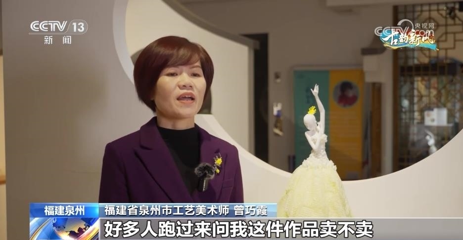 福建省泉州市工藝美術(shù)師 曾巧霞:這件作品是以芭蕾舞的形式去表現(xiàn)的,然后結(jié)合我們德化這種薄胎和手捏花的工藝來(lái)表現(xiàn)整件作品。我把這件作品帶到國(guó)博去展出,好多人跑過(guò)來(lái)問(wèn)我賣不賣,現(xiàn)在不是沒人要,是訂單多到已經(jīng)做不出來(lái)的問(wèn)題了。