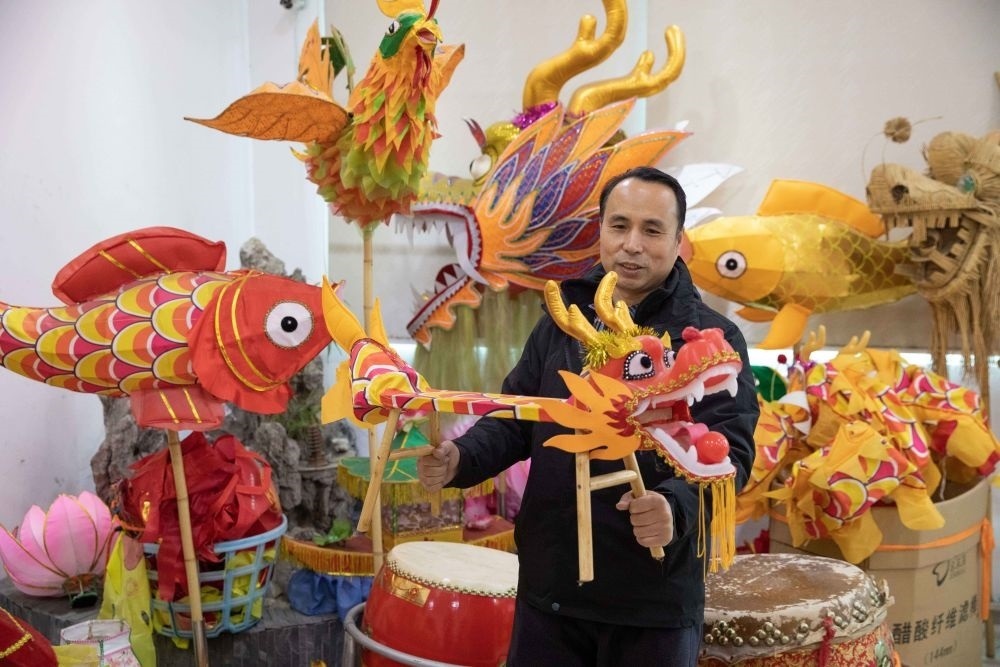 1月30日,南昌市青云譜區(qū)城南龍燈工廠,城南龍燈傳承人史克濱展示為兒童設計生產(chǎn)的小板凳龍。新華社發(fā)(孫睿澤 攝)