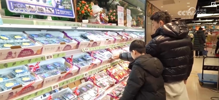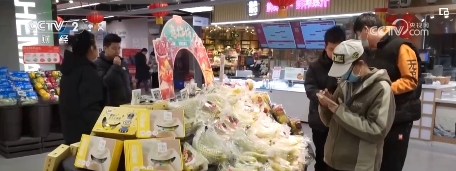 除了蘋(píng)果,各類葡萄、柑橘、車?yán)遄?、草莓、藍(lán)莓、菠蘿、榴蓮等水果也大量上市。僅記者采訪的這家生鮮超市,新奇特品種相比2023年,就有5%—10%的增長(zhǎng),春節(jié)前更是有100多款水果在店內(nèi)銷售,豐富了百姓的“果盤(pán)子”。