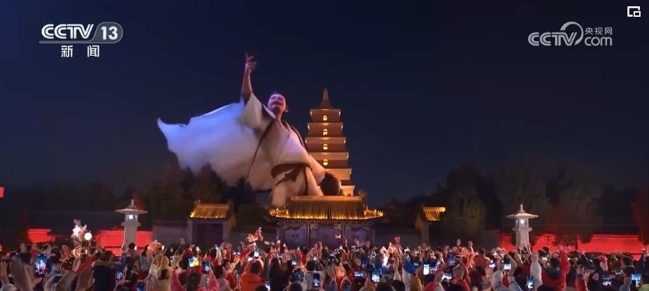 除夕當(dāng)晚9時,西安分會場《山河詩長安》篇章的“打開方式”讓人眼前一亮。在科技助力下,“詩仙”李白跨越歲月長河“穿越”而來,在煙火璀璨中,隨著熙熙攘攘的人群一起走進西安城墻永寧門,走入千年后的耀眼長安。
