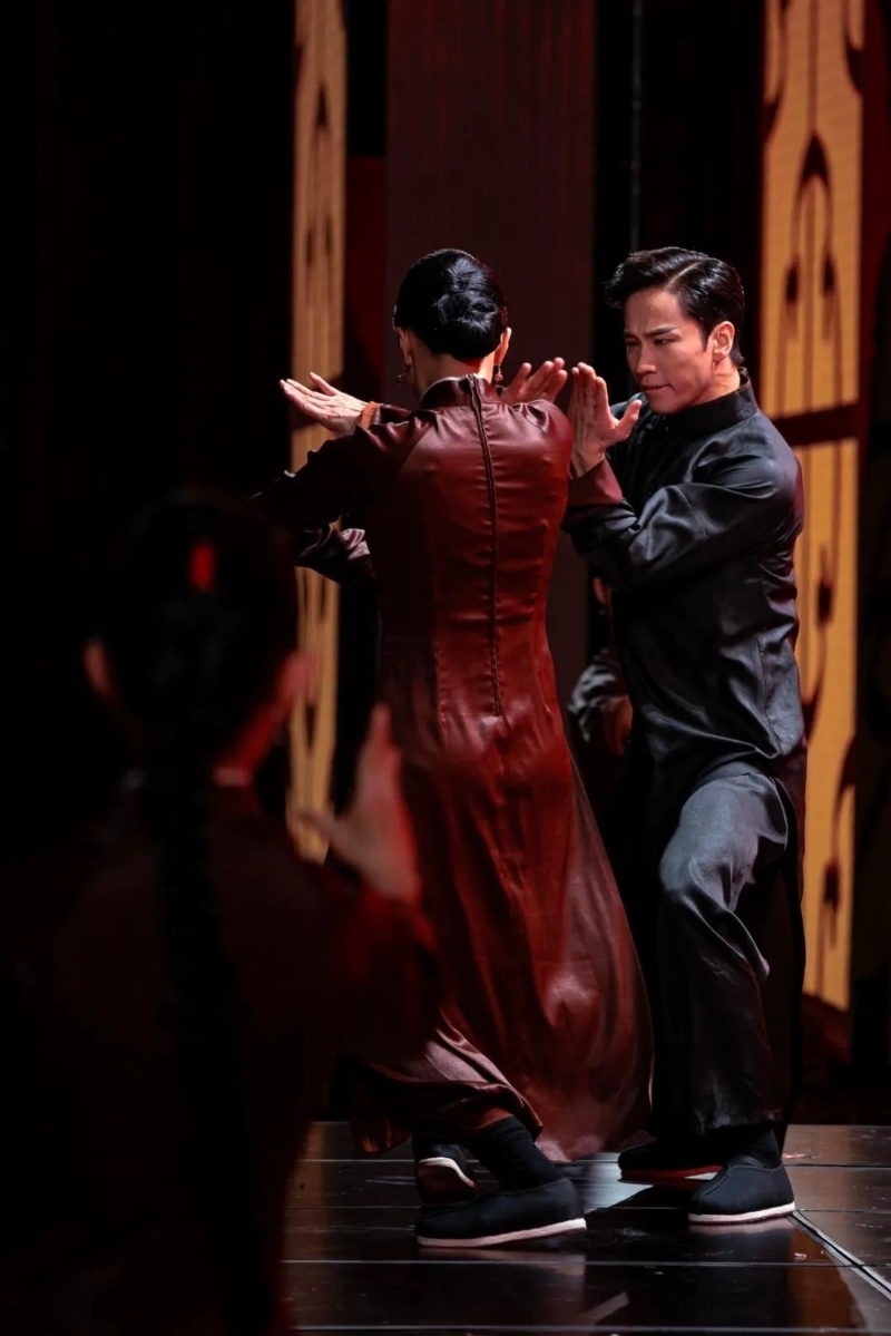 密集的鼓點(diǎn)聲中,一道巨大的人像剪影出現(xiàn)在黃褐色的巨幕上,馬步牢固、拳拳帶風(fēng)。目光正隨著人影挪不開(kāi)眼,只見(jiàn)一個(gè)騰空飛旋過(guò)后,“葉問(wèn)”同步從屏后翻旋而出,來(lái)到臺(tái)前。那人那影,一時(shí)間讓人恍惚,什么叫“形影相隨”,什么叫“弄影團(tuán)風(fēng)”,如今就在眼前!