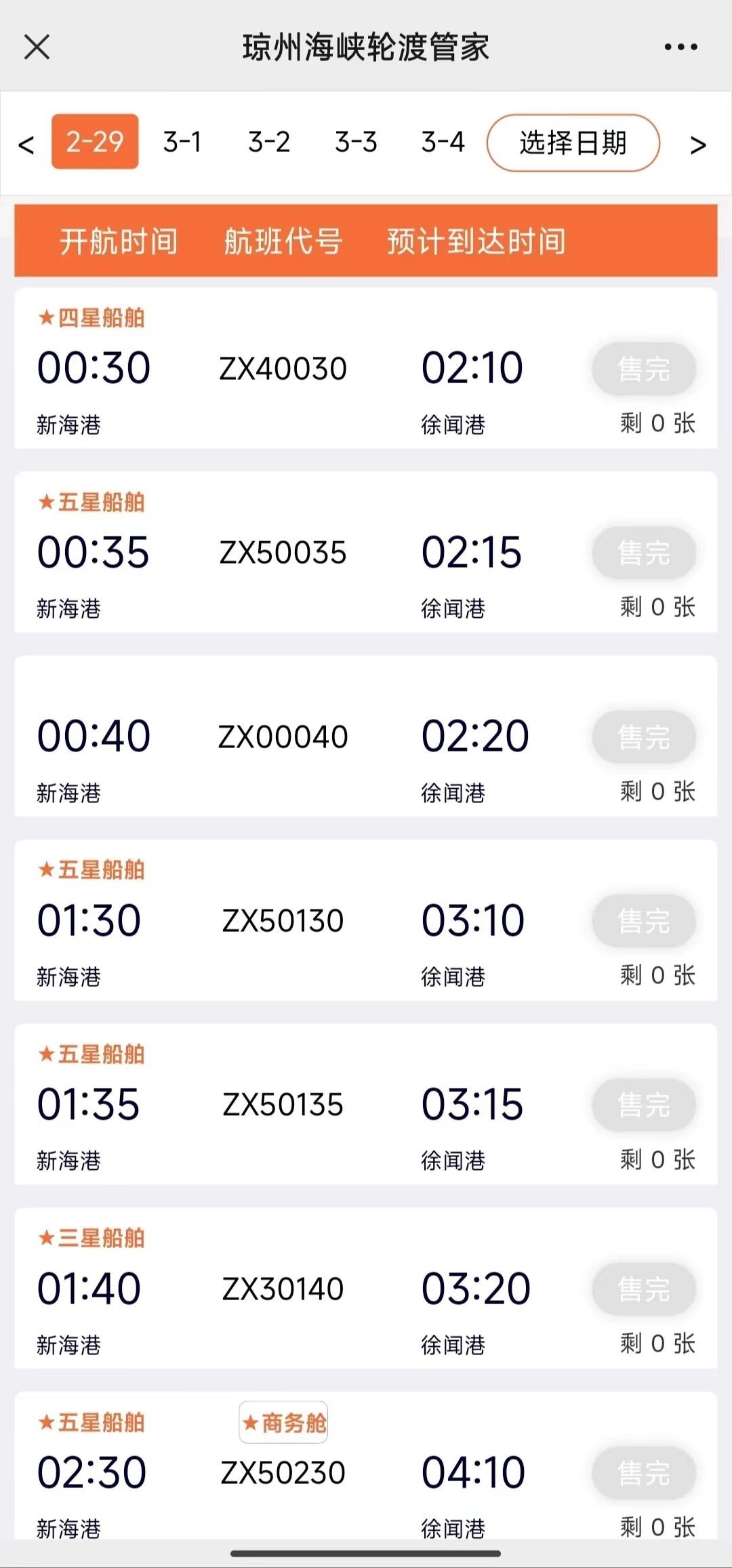澎湃新聞記者17日上午查詢官方購票平臺“瓊州海峽輪渡管家”發(fā)現(xiàn),實時數(shù)據(jù)顯示,??谛潞8壑列炻劯鄣男履茉窜囕喍善保?月17日至2月29日均已售罄。