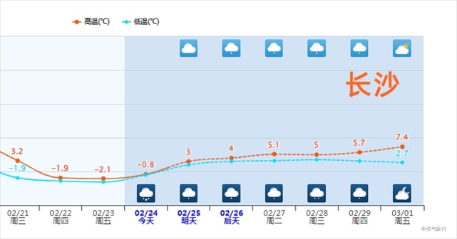 比如長沙,自2月21日14時(shí)以后,氣溫持續(xù)在0℃以下運(yùn)行,已超過70個(gè)小時(shí),2月下旬連續(xù)如此長的低溫,幾乎前所未見。2月的最后幾天,長沙最高氣溫將不超過6℃,今天甚至不到0℃,常年同期平均最高氣溫在10℃以上,比常年冷得多。