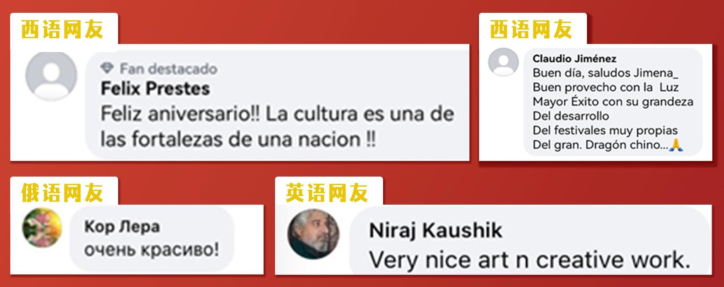 文明魅力無(wú)國(guó)界,中國(guó)文化受海外網(wǎng)友追捧。《彩云追月》《小雅·鹿鳴》《蒲公英的天空》等節(jié)目讓海外受眾領(lǐng)略了元宵晚會(huì)蘊(yùn)含的文化底蘊(yùn)。眾多海外網(wǎng)友紛紛留言表達(dá)了對(duì)中華文化和中國(guó)節(jié)日的喜愛(ài)。西語(yǔ)網(wǎng)友Claudio Jiménez留言:“中國(guó)擁有這么多自己的節(jié)日,好棒”。西語(yǔ)網(wǎng)友Felix Prestes說(shuō):“文化是一個(gè)國(guó)家的基石,祝你們節(jié)日快樂(lè)!”英語(yǔ)網(wǎng)友Niraj Kaushik和Cham Gurung評(píng)論說(shuō):“很美且很有創(chuàng)意的作品”“節(jié)目令人印象深刻,我很喜歡”。