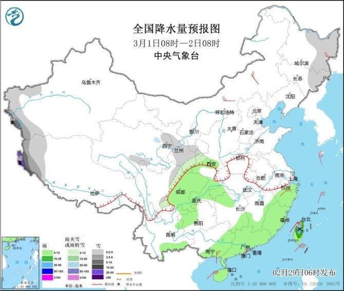 央視網消息:中央氣象臺網站2月29日消息,過去一天,全國雨雪逐漸發(fā)展增強,北方大部以降雪為主,集中在西北地區(qū)東部、內蒙古、山西、山東和東北三省等地;南方地區(qū)雨水范圍明顯擴大,江蘇、上海、浙江、安徽南部、江西中北部、湖南中南部、廣西北部等地部分地區(qū)出現(xiàn)中到大雨,今天凌晨起,蘇皖北部出現(xiàn)雨轉雪,江蘇連云港、宿遷、徐州等地雪花紛飛,并伴隨低溫和大風天氣,體感十分寒冷。
