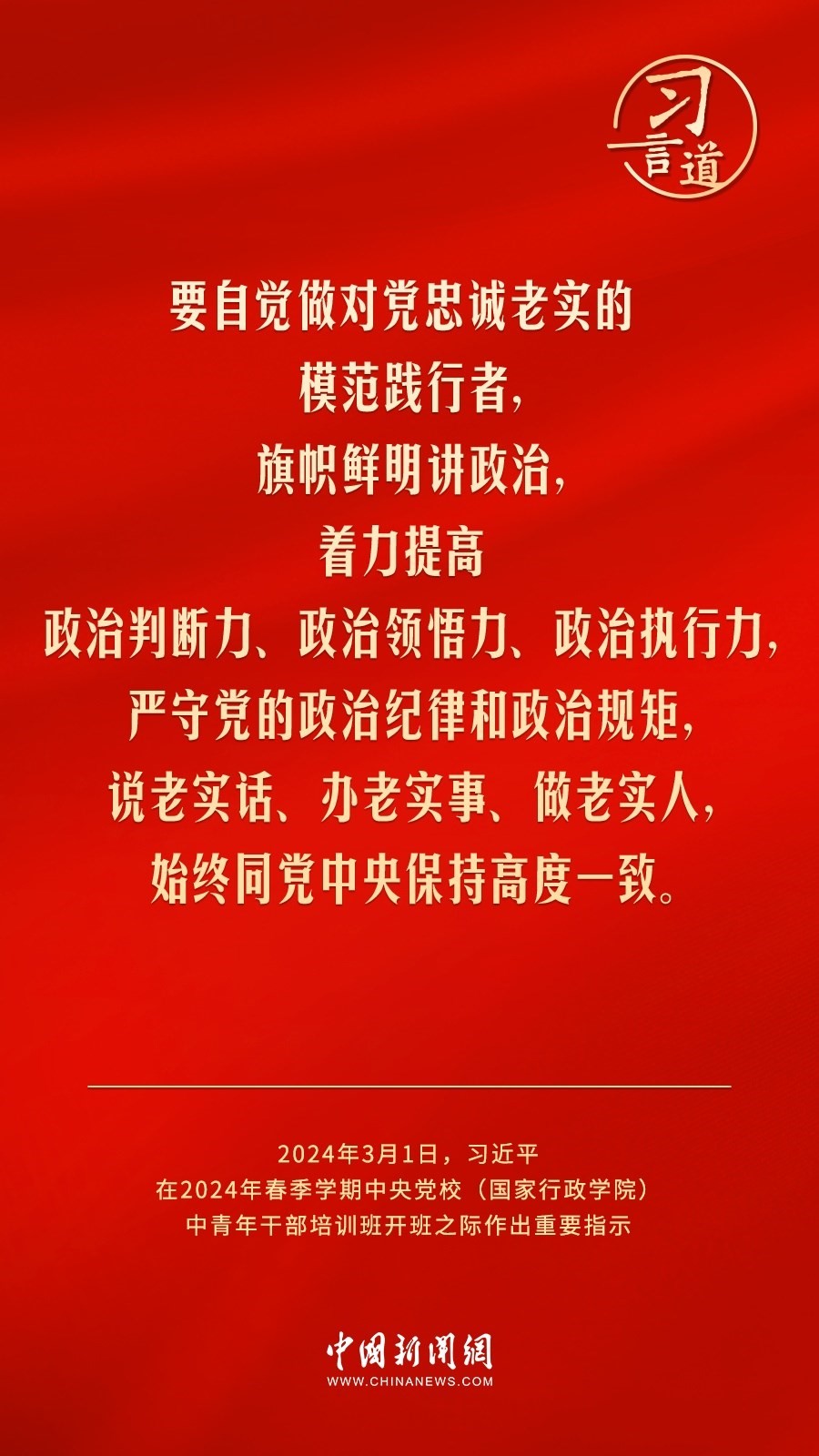 2024年春季學期中央黨校(國家行政學院)中青年干部培訓班3月1日上午在中央黨校開班。中共中央總書記、國家主席、中央軍委主席習近平作出重要指示,他強調——