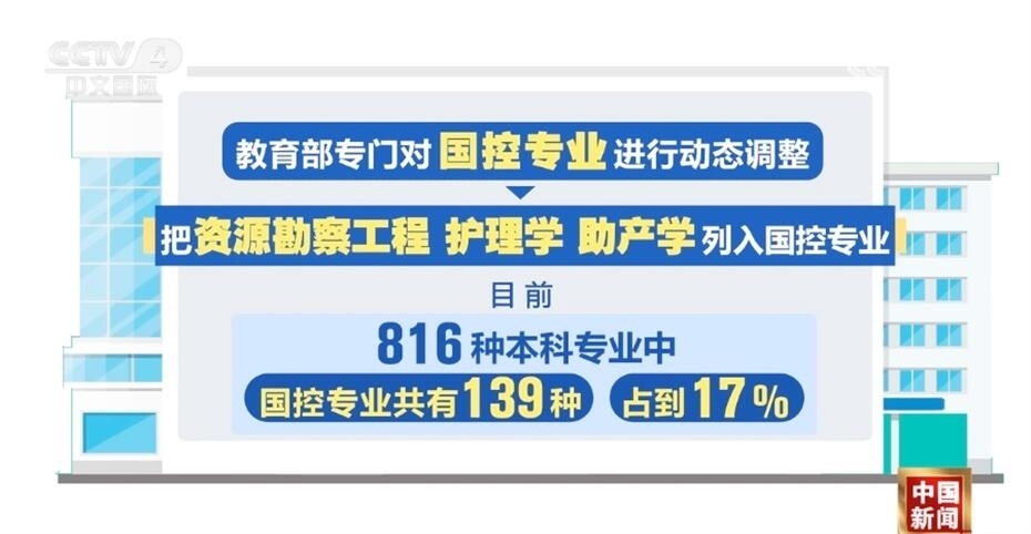 此次教育部專門對(duì)國(guó)控專業(yè)進(jìn)行了動(dòng)態(tài)調(diào)整,把資源勘察工程、護(hù)理學(xué)、助產(chǎn)學(xué)列入了國(guó)控專業(yè)。目前,816種本科專業(yè)中,國(guó)控專業(yè)共有139種,占到17%。未來(lái),國(guó)控專業(yè)范圍還將進(jìn)行“有進(jìn)有出”的動(dòng)態(tài)調(diào)整。