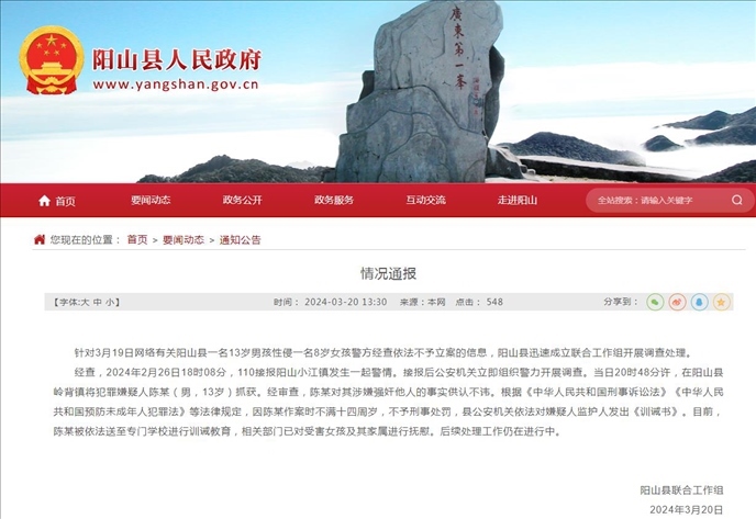 ·官方通報(bào)“13歲男孩性侵8歲女童警方不立案”:涉事男孩已被送至專門學(xué)校進(jìn)行訓(xùn)誡教育。