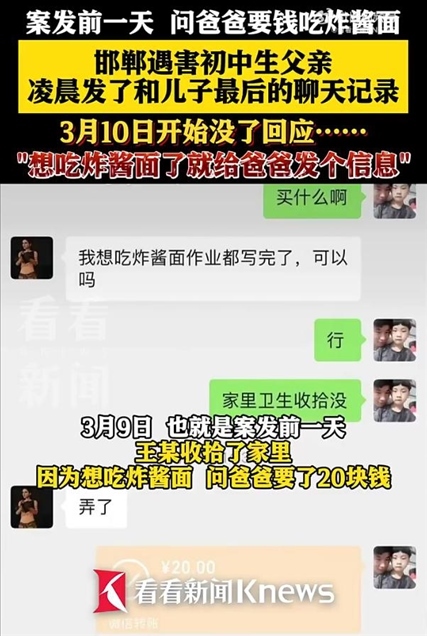 ·3月20日凌晨,邯鄲遇害初中生王某的父親發(fā)布了和兒子的聊天記錄。案發(fā)前一天,王某收拾了家里,因?yàn)橄氤哉ㄡu面,問爸爸要了20塊錢。