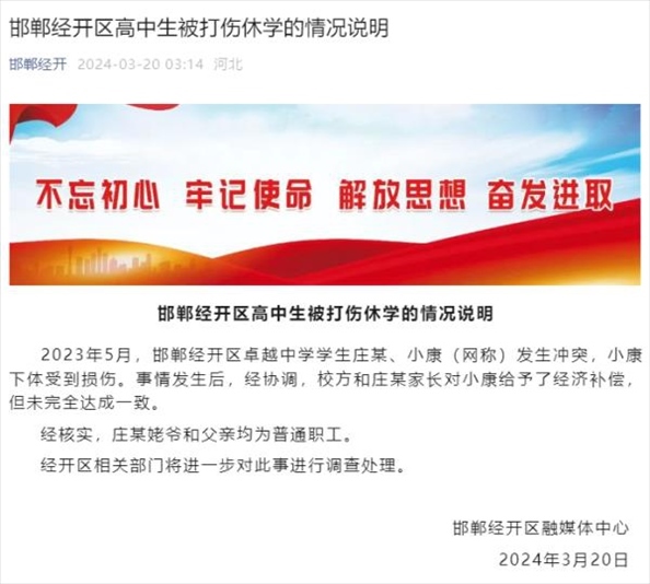 ·河北邯鄲一學(xué)生被同學(xué)打傷睪丸休學(xué),打人者自稱姥爺是縣長,當(dāng)?shù)赝▓?bào)。