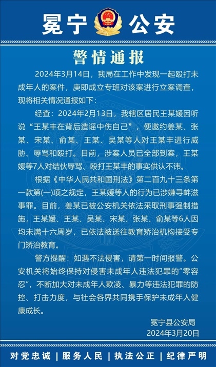 ·四川警方通報(bào)14歲女孩糾集多人圍毆男孩:1人被采取刑事強(qiáng)制措施,6人被送往教育矯治機(jī)構(gòu)。