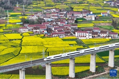 眼下,陜西漢中市百萬(wàn)畝油菜花競(jìng)相綻放,西成高鐵線上,一趟趟列車穿行在金黃色的油菜花海之中,為秦巴山區(qū)勾畫(huà)出朝氣蓬勃的春日景象。