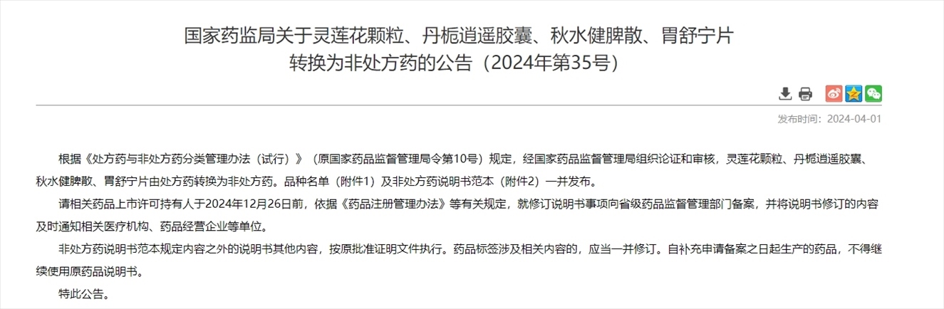 國家藥監(jiān)局:靈蓮花顆粒、丹梔逍遙膠囊、秋水健脾散、胃舒寧片轉(zhuǎn)換為非處方藥