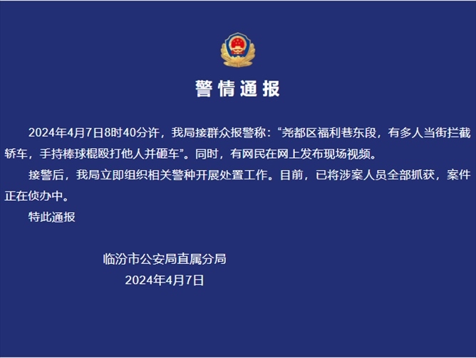 ·臨汾警方通報多人持棒球棍毆打他人并砸車:涉案人員全部抓獲。