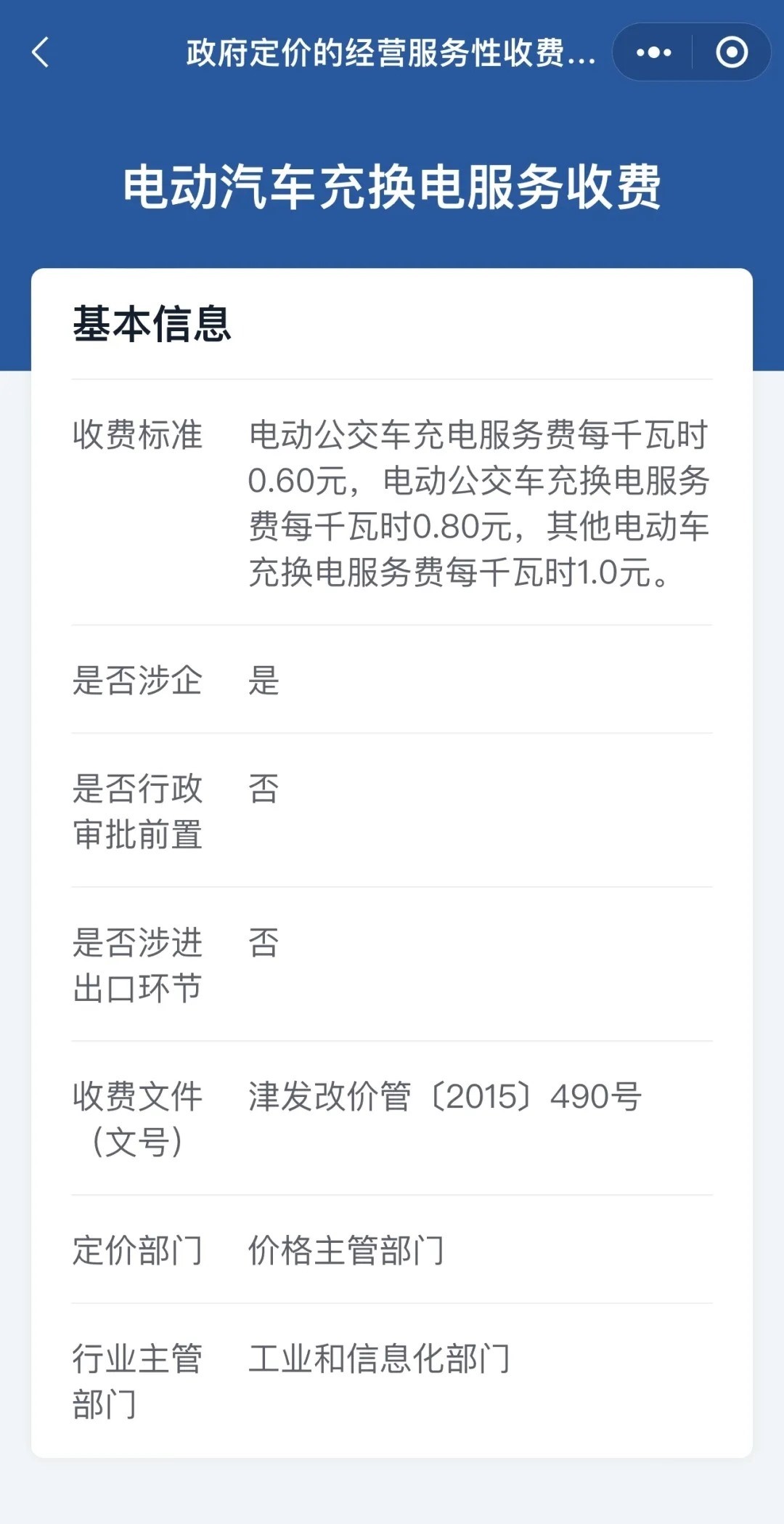 點(diǎn)擊定價(jià)項(xiàng)目名稱,就會看到具體的收費(fèi)標(biāo)準(zhǔn)、收費(fèi)文件、定價(jià)部門、行業(yè)主管部門、是否涉企等多項(xiàng)信息。