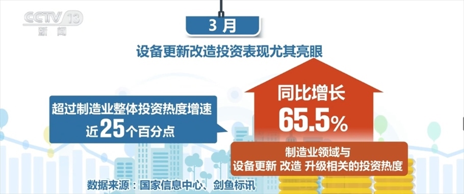 制造業(yè)領域則更為突出,1—2月,制造業(yè)投資熱度指數同比增長13.3%,3月迅速提升至40.6%,遠高于全國總體投資熱度增速。設備更新改造投資表現(xiàn)尤其亮眼,3月,制造業(yè)領域與設備更新、改造、升級相關的投資熱度同比增長65.5%,超過制造業(yè)整體投資熱度增速近25個百分點。