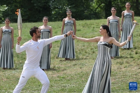 4月16日,第一棒火炬手——希臘運(yùn)動(dòng)員、東京奧運(yùn)會(huì)男子賽艇項(xiàng)目金牌得主斯特凡諾斯·恩圖斯科斯(前左)從扮演最高女祭司的演員瑪麗·米娜手中接過(guò)橄欖枝。