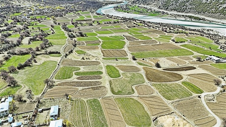 順著村里蜿蜒曲折的桃花路,我們和村民一邊聊一邊走向春天的田野。無人機在田間騰空而起,拍攝的畫面讓我們驚艷到跳起來——坡地上一塊塊農田形狀各異、肌理分明,有的如同一枚葉脈完整的標本,有的如同孩童描繪的抽象畫,有的如同精巧裁剪的扇面……新翻播種的農田呈現(xiàn)出內斂的深褐色,去冬播種的冬小麥是油嫩嫩的新綠,田埂上含苞的桃花氤氳成一片褐粉色。