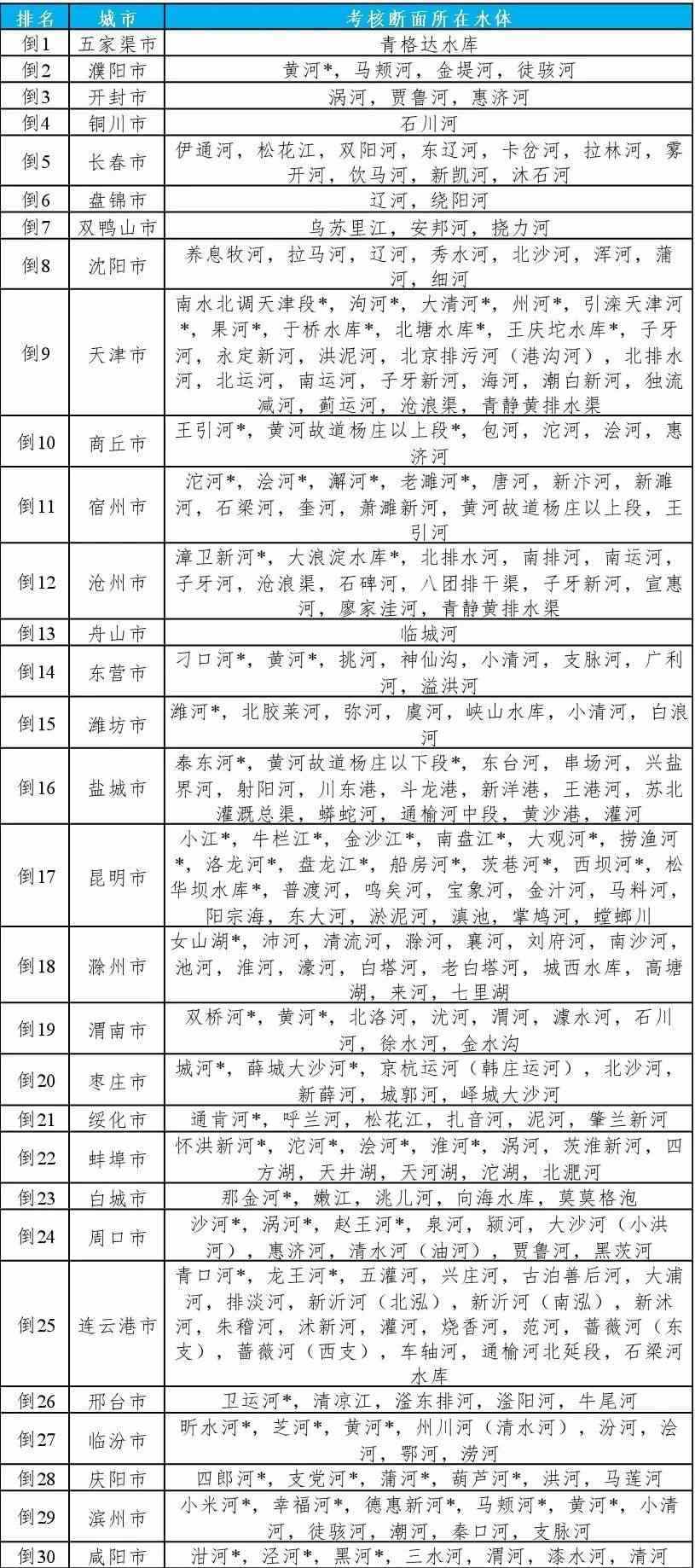 地級及以上城市國家地表水考核斷面排名