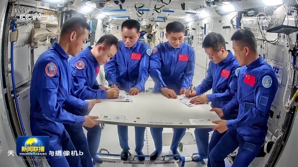 下午三時許,神舟十七號航天員湯洪波、唐勝杰、江新林和神舟十八號航天員葉光富、李聰、李廣蘇在空間站天和核心艙在軌舉行交接儀式,6名航天員分別在確認書上簽字。