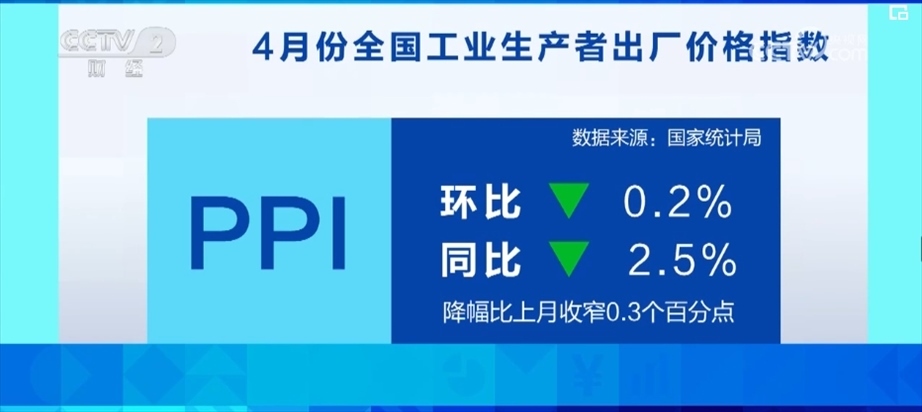 4月份,工業(yè)生產(chǎn)繼續(xù)恢復(fù),全國工業(yè)生產(chǎn)者出廠價格指數(shù)PPI環(huán)比下降0.2%,同比下降2.5%,降幅比上月收窄0.3個百分點(diǎn)。