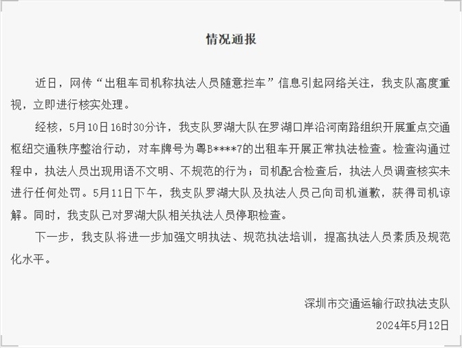 ·深圳出租車司機(jī)稱執(zhí)法人員隨意攔車?官方發(fā)布情況通報(bào)。