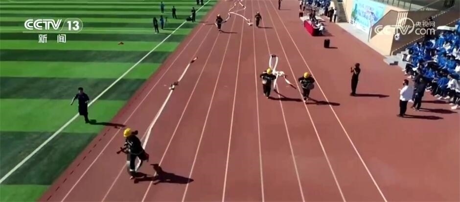 發(fā)令員一聲哨響,幾名消防員手持水槍水帶,飛快向前沖出。這是在山東濟(jì)寧某中學(xué)舉行的首屆“消防安全運(yùn)動(dòng)會(huì)”上,消防員模擬救援現(xiàn)場(chǎng)進(jìn)行的四百米五帶三槍操法展示。